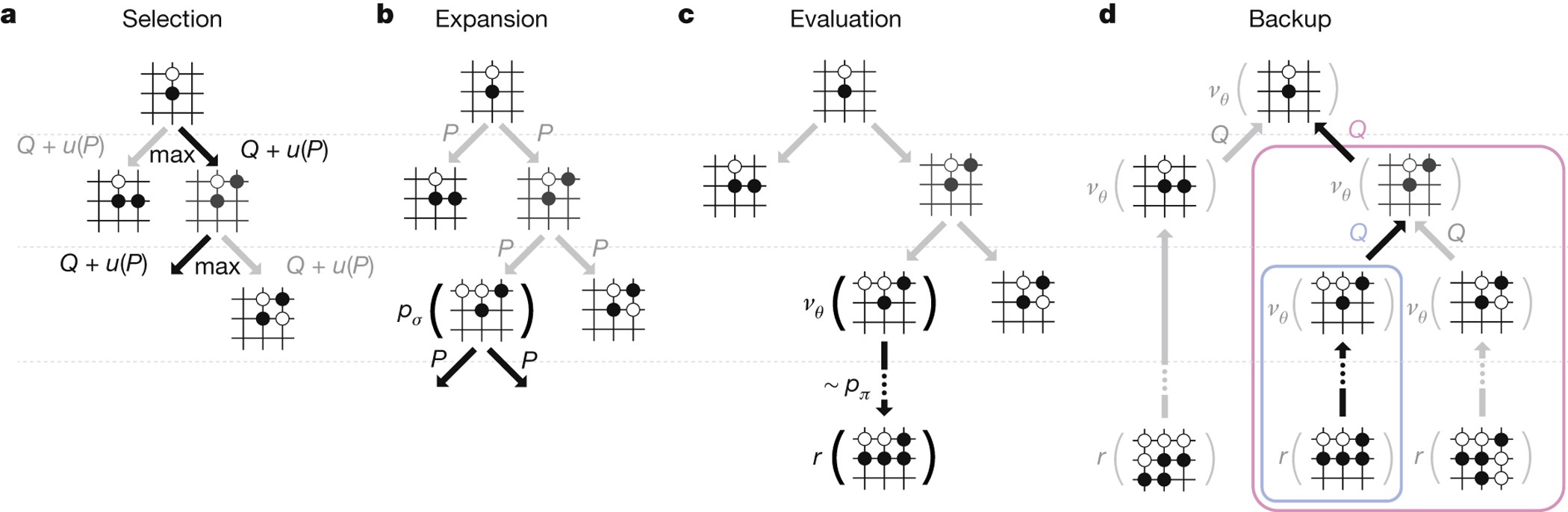 - Monte Carlo tree search (MCTS): Combining the policy network, value network, and rollouts in a four-step search procedure used at execution time.