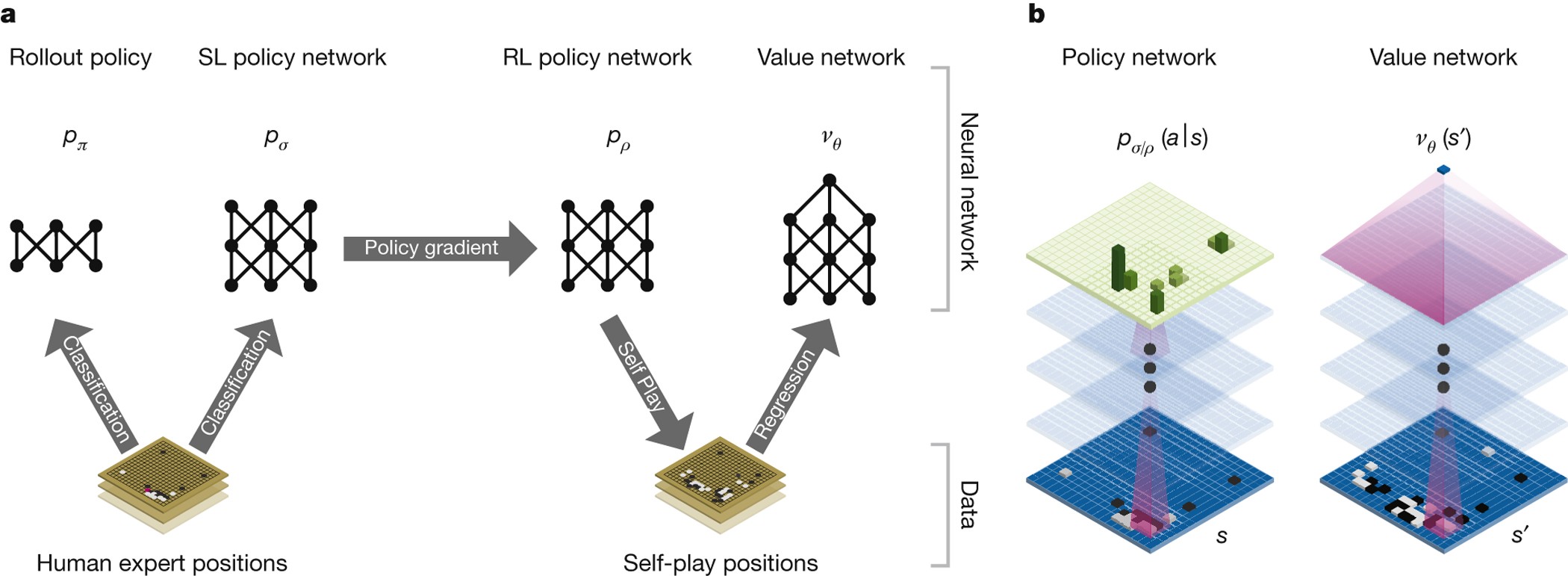 The policy network is a deep convolutional neural network (CNN) that takes a board state s as input and outputs a probability distribution over all legal moves:
